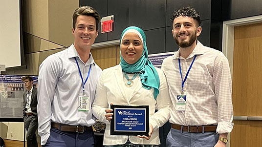 Dr. Yosra Helmy, assistant professor in microbiology at the Gluck Center, has received the 2023 University of Kentucky Excellent Undergraduate Research Mentor Award. She was nominated by students Grant Kelley and Rami Musa and received the award at this afternoon’s Showcase of Undergraduate Scholars among a pool of 50 nominees.