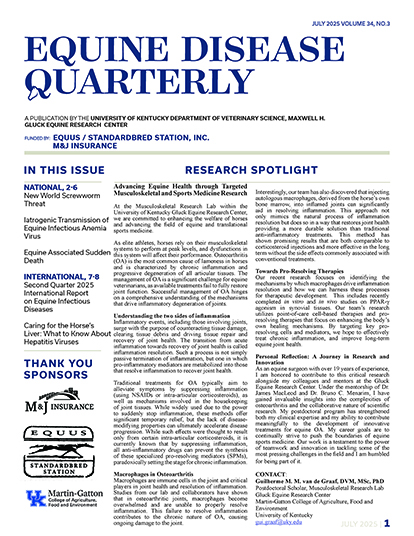 Equine Disease Quarterly is published digitally in January, April, July and October by the Maxwell H. Gluck Equine Research Center. It is sponsored by Equus Standardbred Station and M&J Insurance.